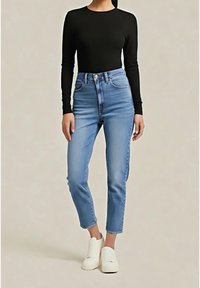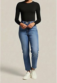 Persona vestida con una camiseta negra de manga larga, jeans de tiro alto azul claro y zapatillas blancas, de pie contra un fondo liso.