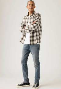 Vaqueros de mezclilla azul claro con acabado desteñido, ajuste ceñido y cinco bolsillos. Combinados con zapatillas negras de caña alta. Camisa de cuadros con patrón abierta.