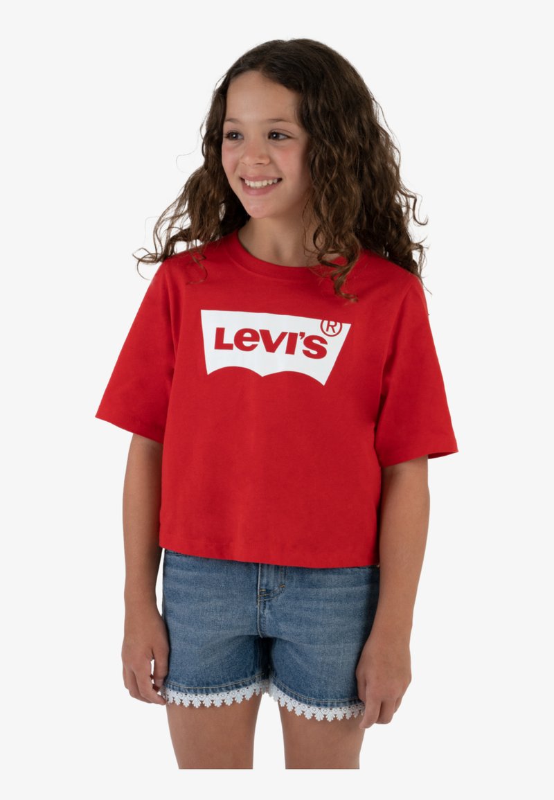 Camiseta de algodón roja con el logotipo blanco de Levi's, combinada con pantalones cortos de mezclilla con encaje en el dobladillo. Textura suave y corte holgado.