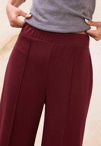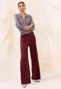 Mujer vistiendo pantalones burdeos de pierna ancha y talle alto, combinados con zapatos de punta con estampado de serpiente y una blusa gris de manga larga.