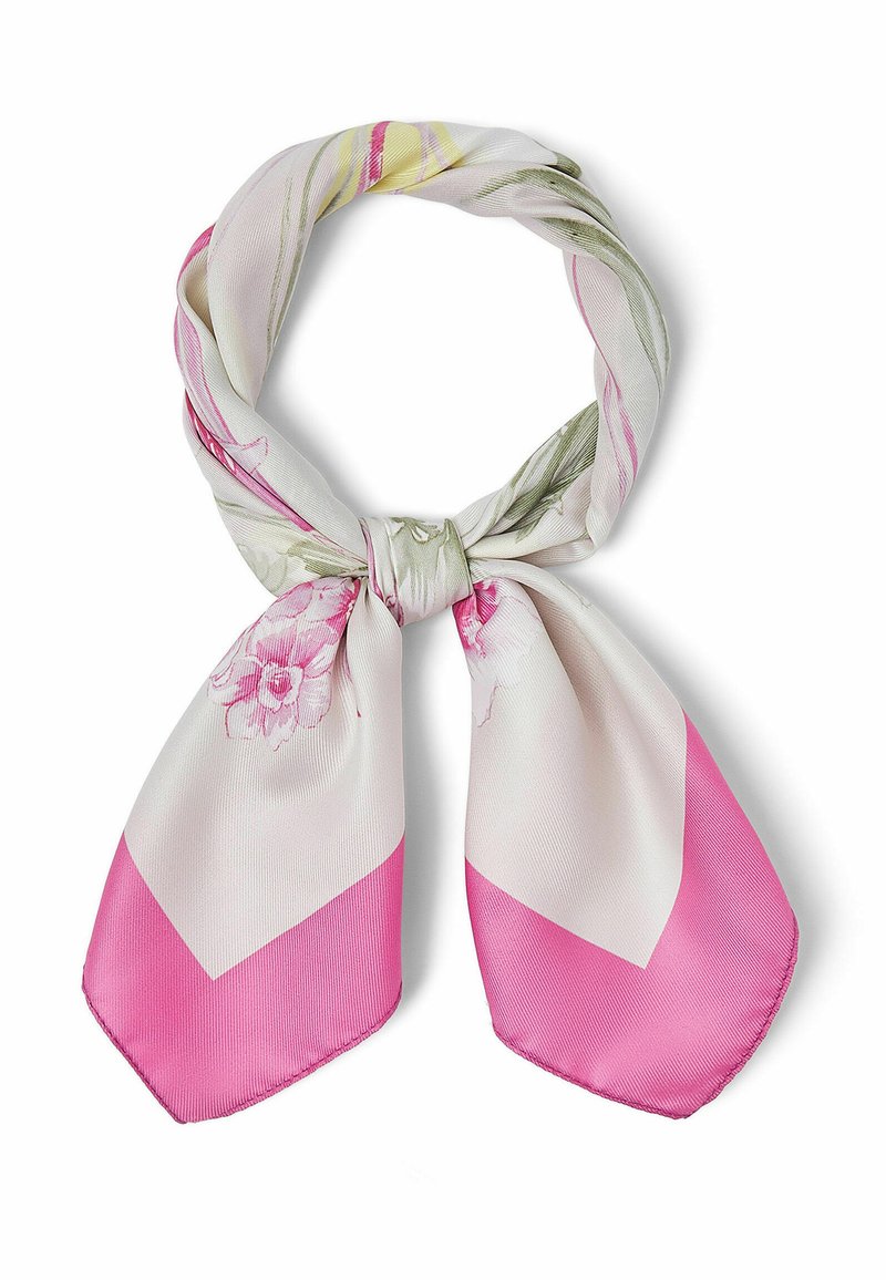 Pañuelo cuadrado de seda con bordes rosas y patrones florales, atado en un nudo suelto.