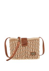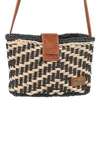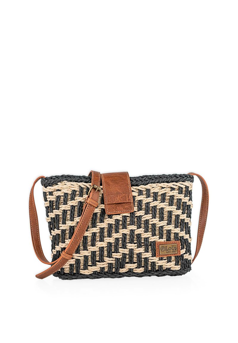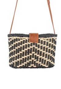 Bolso cruzado tejido en tonos negros y naturales, con una correa y cierre de piel marrón, forma rectangular y superficie texturizada.