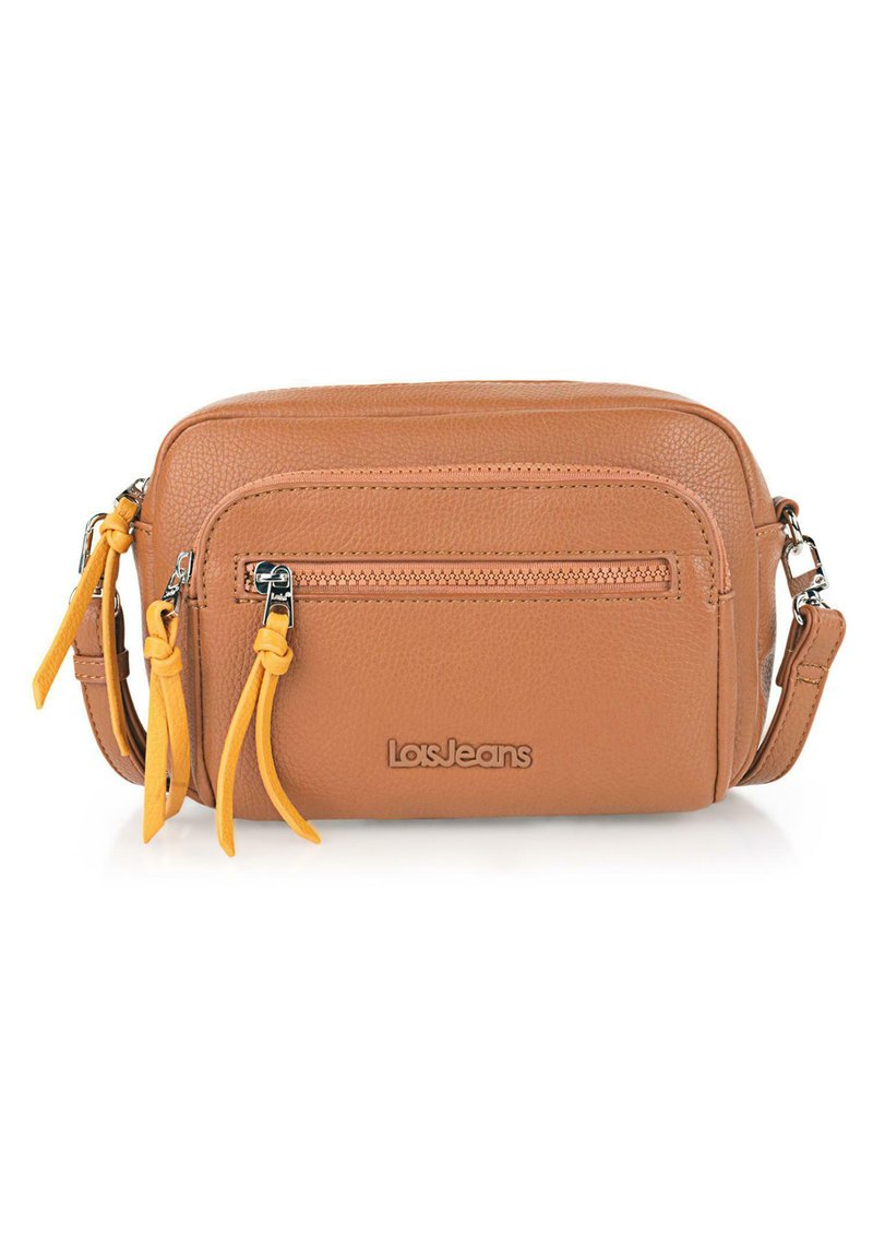 Bolso bandolera de piel marrón con herrajes plateados, un bolsillo con cremallera en la parte frontal y acentos de borlas amarillas. Logo grabado en la parte delantera.