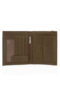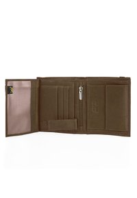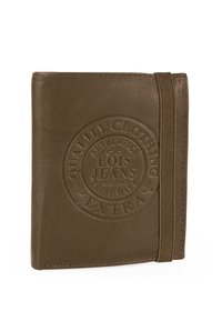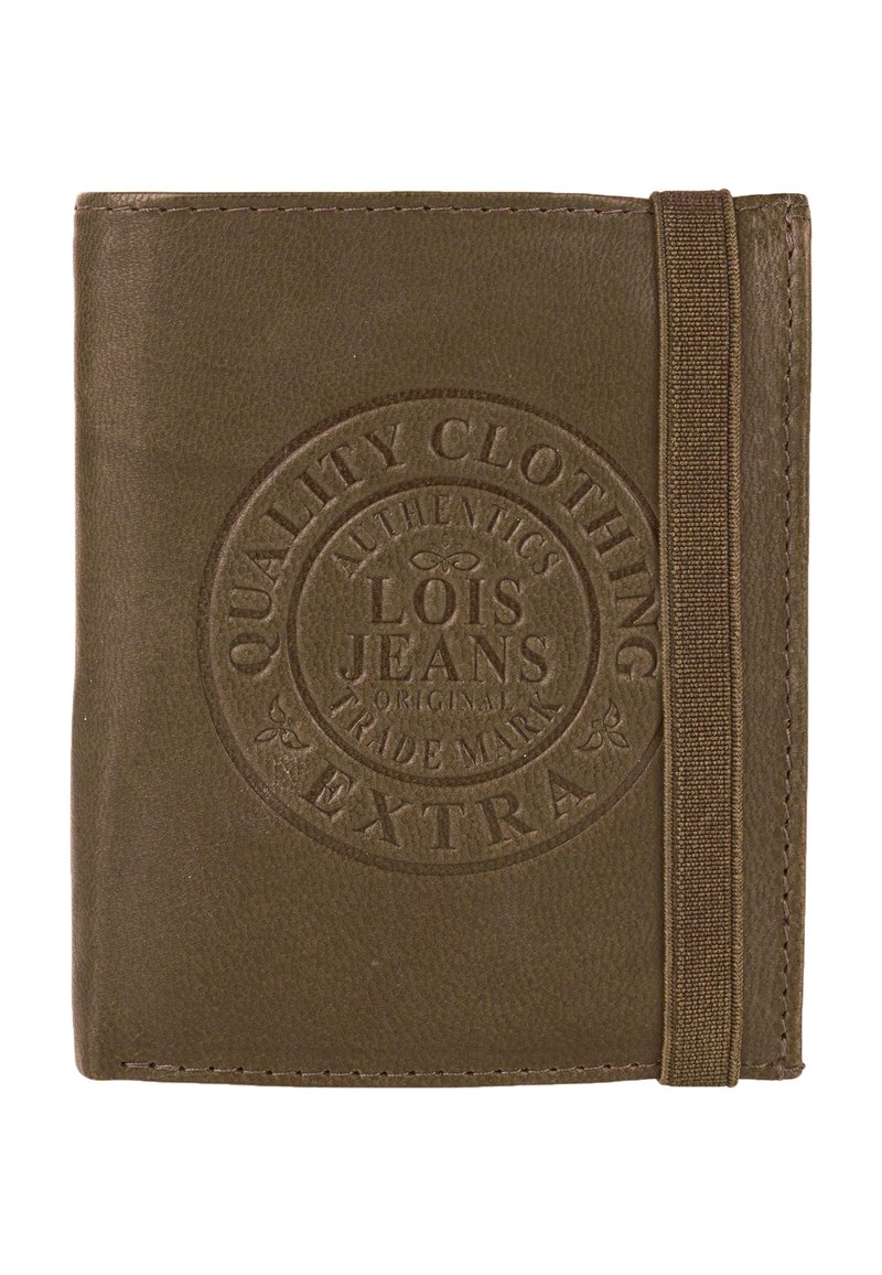 Billetera de cuero marrón con logotipo y texto en relieve, cierre de banda elástica, forma rectangular, textura suave y diseño minimalista.