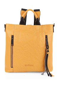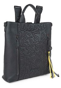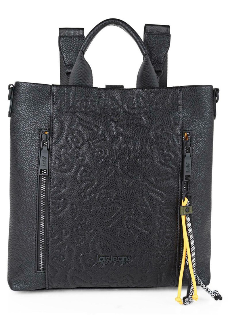 Mochila de cuero negro con patrón texturizado, dos cremalleras laterales, asas superiores dobles y correas ajustables. Presenta el logotipo y cordones de colorido acento.