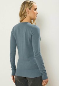 Mujer con cabello largo y rubio lleva un cárdigan azul apagado, ajustado y abotonado, con los brazos cruzados, de pie frente a una pared lisa de color claro.