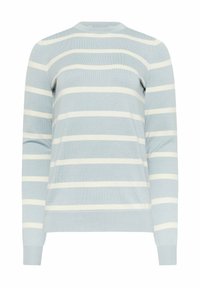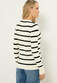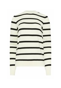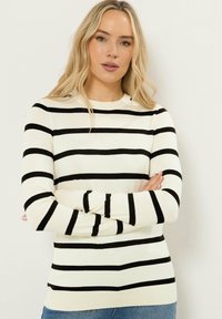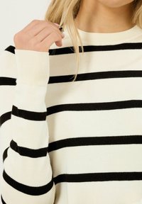 Mujer rubia con el cabello suelto, vistiendo un suéter blanco con rayas horizontales negras, con los brazos cruzados, posando frente a un fondo liso y claro.