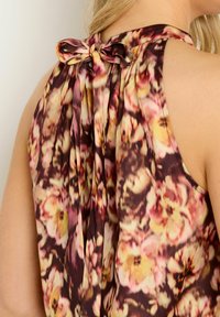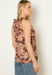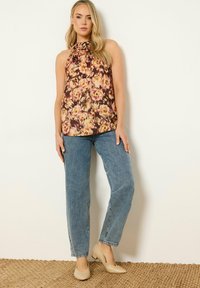 Mujer rubia con una blusa sin mangas y de cuello alto con estampado floral en tonos rosa y marrón, combinada con vaqueros azules, de pie frente a un fondo claro.