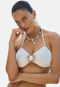 Mujer con bikini negro sin tirantes con un broche en forma de sol, complementado con pendientes dorados y pulseras naranjas y doradas, sobre un fondo liso.