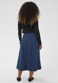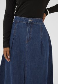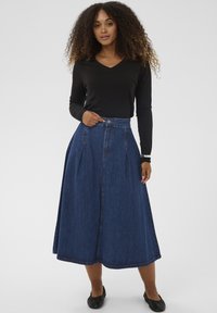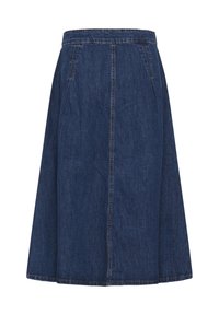 Falda vaquera de línea A en azul oscuro, con pliegues delanteros, cierre de botones y costuras sutiles a lo largo del dobladillo. Combina con zapatos planos negros.