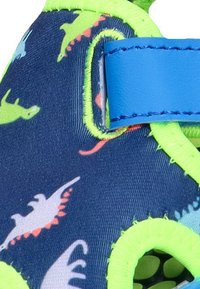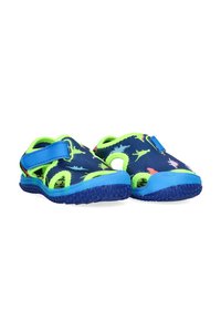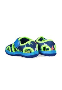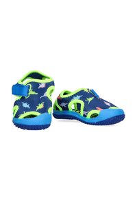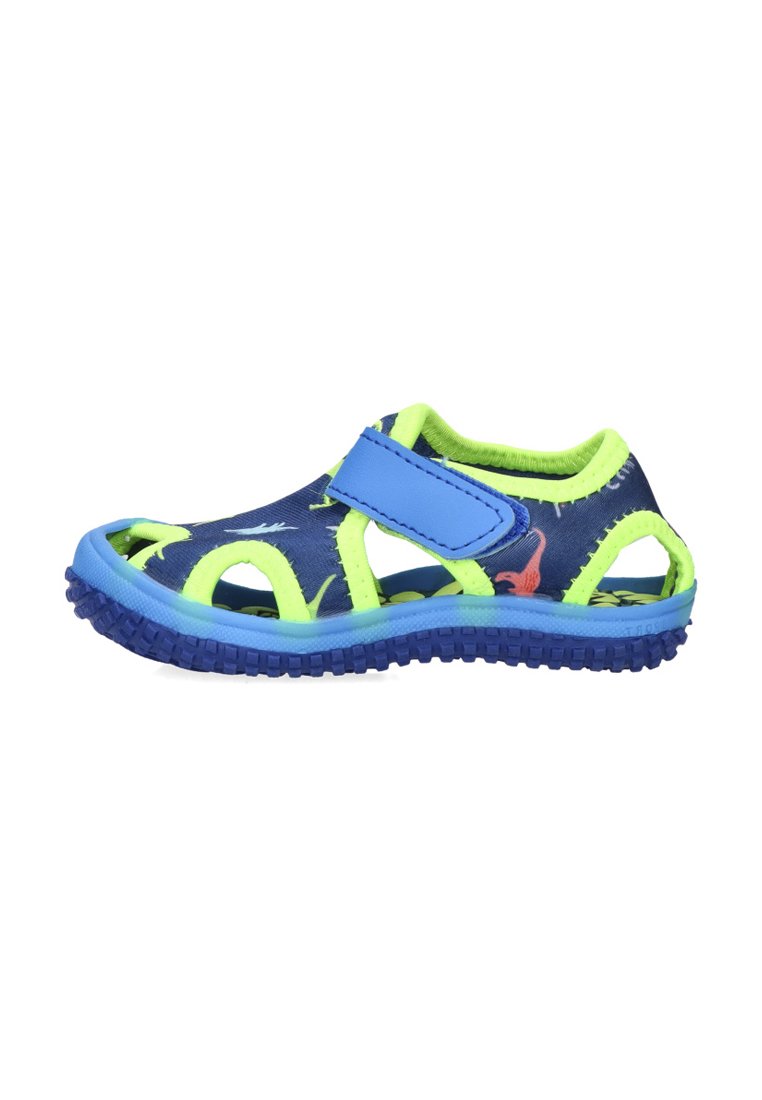 Sandalia azul y verde neón con diseño abierto, correa de Velcro y suela de goma texturizada. Presenta un patrón de hojas tropicales y aves.
