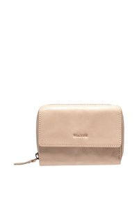 Cartera de cuero marrón con una textura suave, cierre de cremallera y solapa delantera. Presenta costuras sutiles y una marca en relieve.