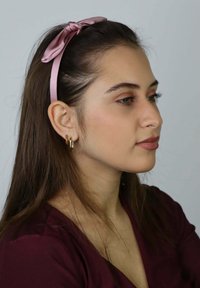 Diadema rosa de satén con un detalle anudado, usada sobre cabello largo y castaño. Se llevan pendientes circulares de aro dorado, sobre un fondo gris claro.