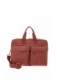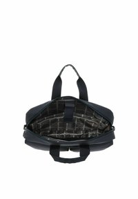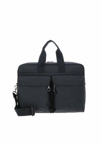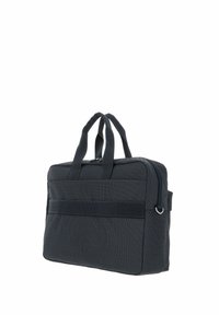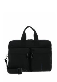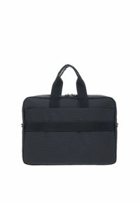 Bolsa para portátil de tela negra con un patrón texturizado, doble asa superior, dos bolsillos delanteros con cremallera y una correa de hombro ajustable.
