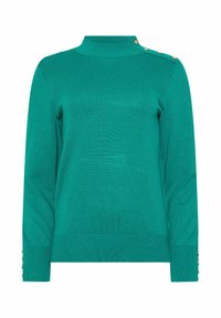 Suéter burdeos con un cuello alto, puños acanalados con acentos de botones plateados y un diseño ajustado, hecho de un material de punto suave y elástico.