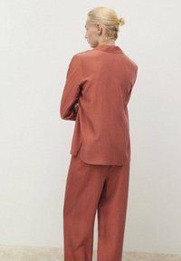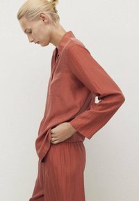 Conjunto de pijama color óxido hecho de una tela suave, que incluye una camisa con botones y pantalones de pierna ancha con un corte relajado y un bolsillo en la camisa.