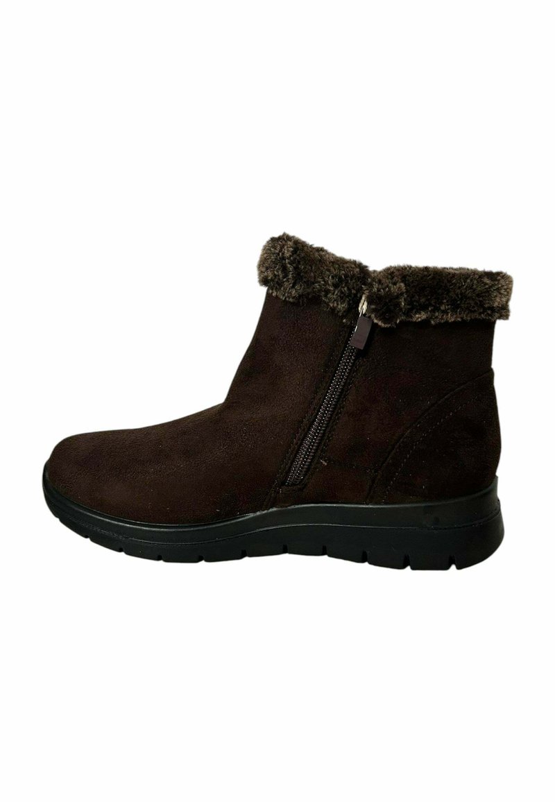 Bota de ante marrón hasta el tobillo con cierre de cremallera y cuello de piel sintética. Cuenta con una suela de goma negra texturizada para mayor tracción.