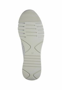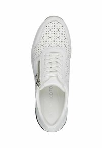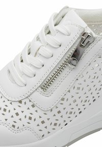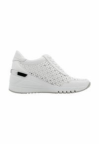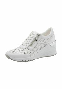 Zapatilla blanca con diseño perforado, cremallera plateada y tacón de cuña. Material liso con detalles texturizados y suela de goma.