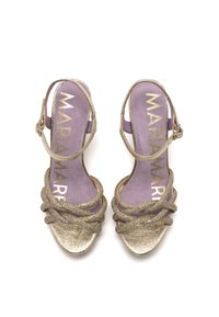 Piernas femeninas con sandalias de tacón alto metálicas doradas con tiras delanteras trenzadas y cierre de hebilla en el tobillo sobre fondo blanco.