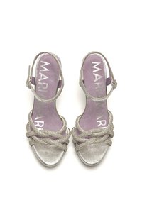 Sandalias de tacón alto plateadas para mujer, modelo Acate de Mariamare. Con tiras delanteras trenzadas en acabado brillante y tira en el tobillo con cierre de hebilla, ofrecen sujeción y un ajuste cómodo. La suela de plataforma delantera compensa la altura del tacón fino y estiliza la silueta sin renunciar a la estabilidad. Ideales para eventos, celebraciones o looks de invitada, el luminoso tono plateado combina bien con vestidos y outfits más formales. Con plantilla Airfit para mejor amortiguación y mayor comodidad en cada paso. Certificado VEGANO por INESCOP, lo que garantiza que la naturaleza química principal del material no consiste en fibras de origen animal.