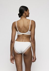 Sujetador blanco con escote pronunciado y ribete de encaje, con tirantes ajustables, combinado con braguitas de bikini a juego con detalles de encaje. Tejido suave y textura delicada.