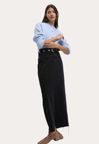 Cárdigan de punto acanalado de color azul claro con cuello redondo, con cuatro botones decorativos y llevado sobre una falda negra de talle alto con cinturón.