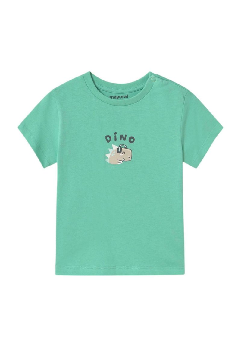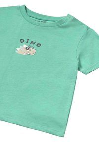 Camiseta de manga corta color verde menta con un gráfico de dinosaurio y la palabra "DINO" impresa arriba. Material suave de algodón con cierre a presión en el hombro.