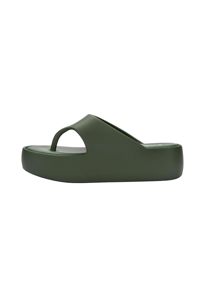 Sandal con plataforma de color verde oliva, con una amplia correa superior y un separador de dedos, diseñado para uso casual.