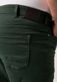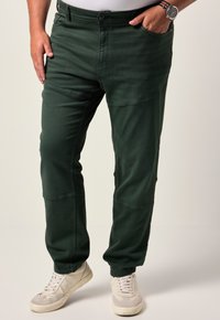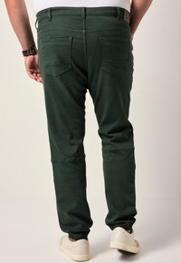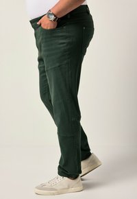 Hombre con pantalones verdes oscuros ajustados en el tobillo con puños elásticos y zapatillas blancas, mano en el bolsillo y reloj en la muñeca.