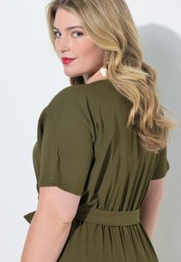 Mujer vestida con mono de manga corta color verde oliva con cinturón en la cintura y sandalias de tacón alto color beige, de pie frente a un fondo blanco.