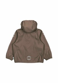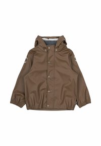Impermeable marrón con capucha, botones a presión, puños elásticos y detalles reflectantes para mayor visibilidad, acompañado de pantalones a juego.