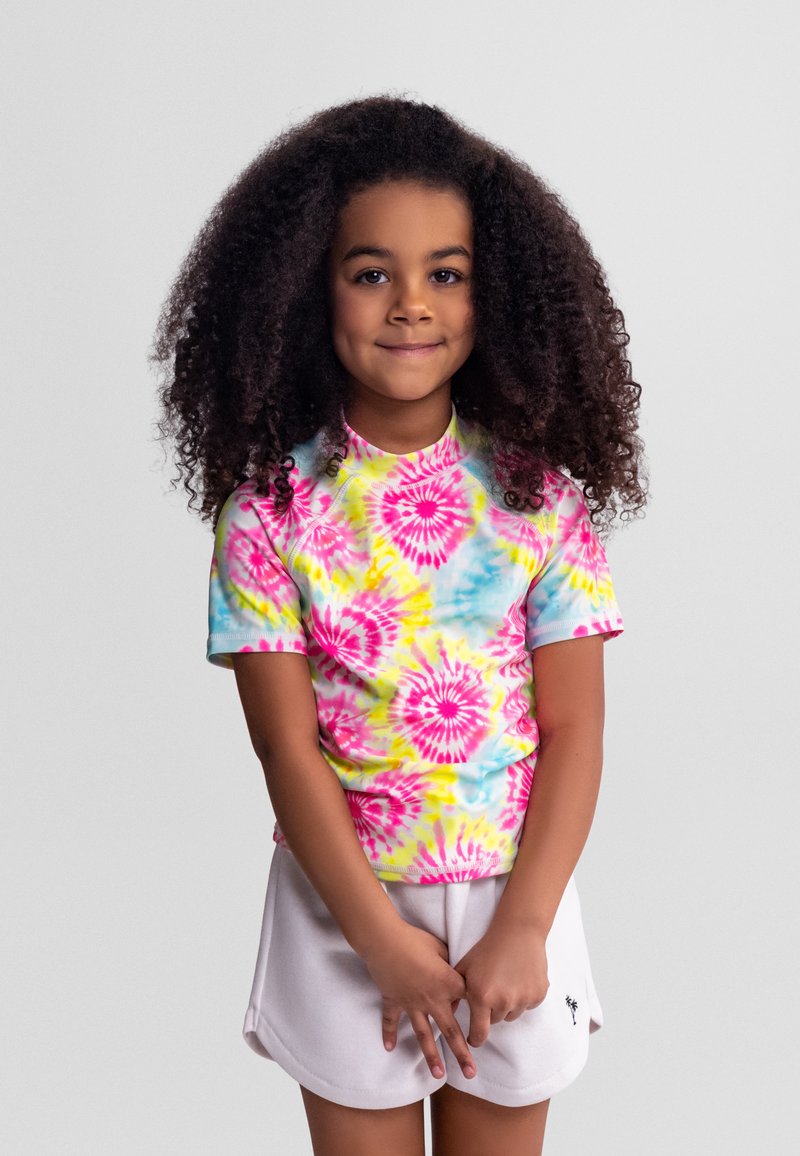 Niña joven con cabello rizado y voluminoso, vistiendo una camiseta de colores vivos tipo tie-dye y pantalones cortos blancos, posando frente a un fondo liso.