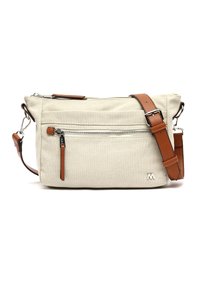 Bolso bandolera de lona beige con bolsillo frontal con cremallera, correa ajustable de cuero marrón, herrajes plateados y pequeño logo metálico en la parte inferior derecha.