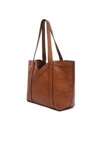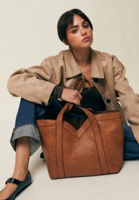 Mujer con chaqueta beige oversize, top oscuro, vaqueros azules remangados, bailarinas negras, sosteniendo un gran bolso tote de cuero marrón sobre un fondo liso.