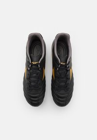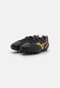Zapatilla de fútbol negra estilo taco con logo dorado y marca "Monarcida Neo", con tachones moldeados y detalles cosidos en la parte superior.