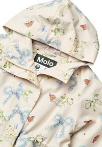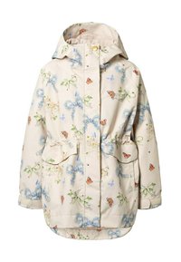 Chaqueta con capucha beige con patrones florales y de mariposas, bolsillos delanteros, cintura ajustable y cierre de botones a presión.