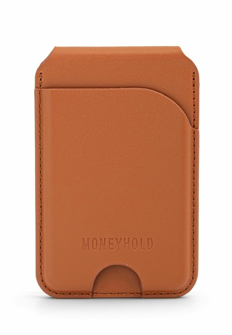 Tarjetero de cuero marrón claro con bordes cosidos, bolsillo delantero y la palabra "MONEYHOLD" grabada en el centro delantero.