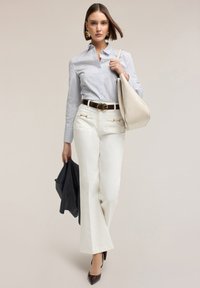 Mujer con camisa a rayas azul y blanca abotonada, pantalones blancos con cadenas doradas decorativas, cinturón oscuro con hebilla dorada y pendientes de flores doradas.