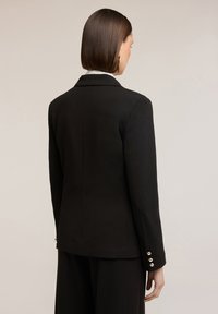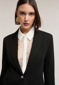 Mujer vestida con blazer y pantalones negros a medida sobre una camisa blanca con cuello de encaje, con grandes pendientes dorados llamativos, posando frente a un fondo claro.