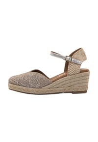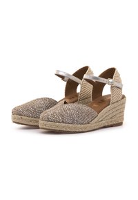 Sandalias de cuña con parte superior de metal plateado tejido y suela de yute natural, con una correa de tobillo con hebilla plateada.