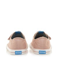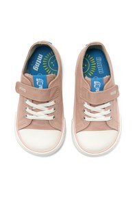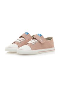 Zapatillas de lona rosas con puntera de goma blanca, acento azul en la lengüeta y correa de velcro junto con los cordones. Presenta un cuerpo texturizado y una suela a rayas.