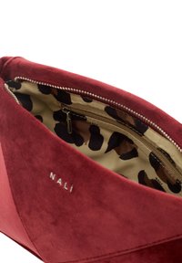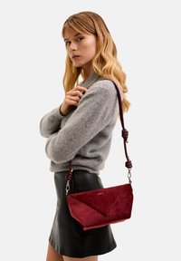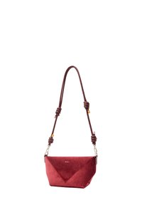 Bolso de ante rojo con un diseño geométrico, que cuenta con una correa anudada y acentos de hardware dorado. Textura suave con una base plana.