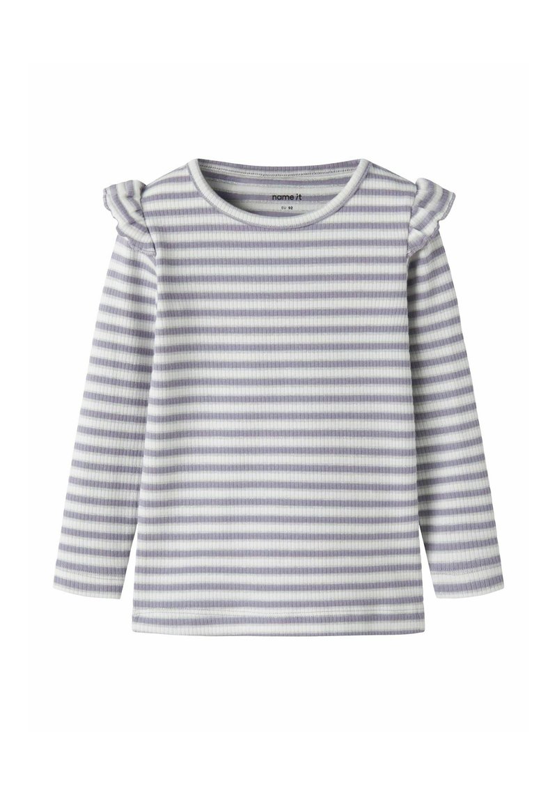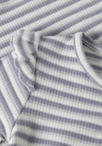 Top de manga larga en rayas blancas y morado claro, textura acanalada, con detalles fruncidos en los hombros y escote redondo.