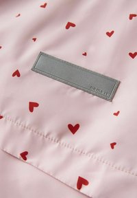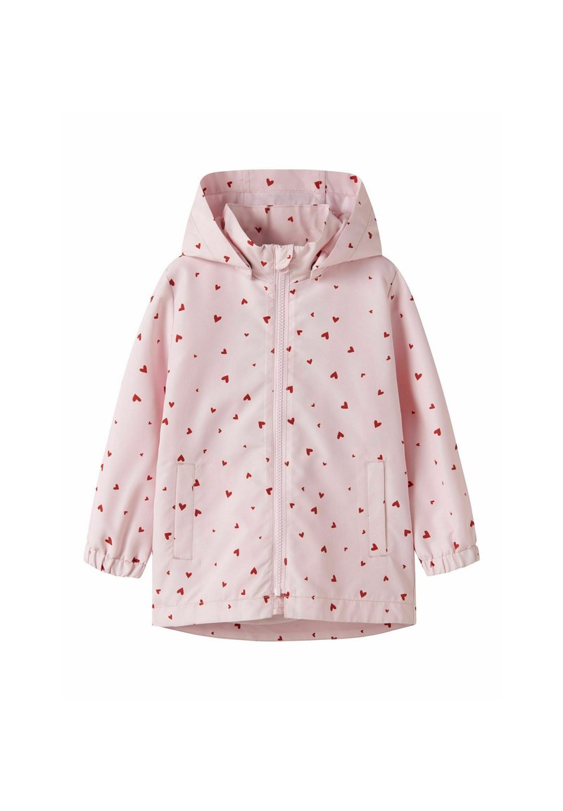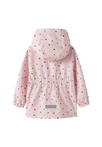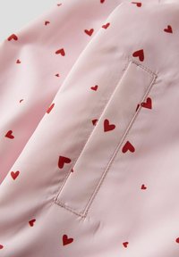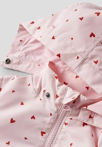 Impermeable rosa claro con capucha, estampado de corazones rojos, cremallera frontal, puños elásticos y dos bolsillos laterales.