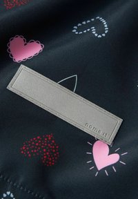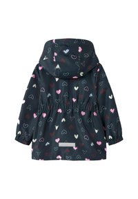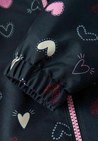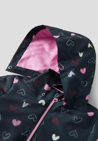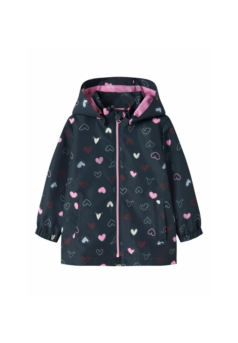 Impermeable infantil azul marino con capucha, forro rosa, cremallera frontal, puños elásticos y estampado de corazones multicolores por todo el abrigo.