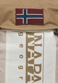 Mochila Napapijri beige y blanca con correas marrones, parche de la bandera noruega y texto "GPS - ET MAPPING SUR" en el panel inferior frontal.