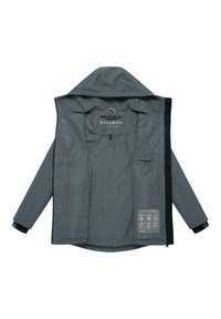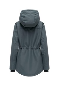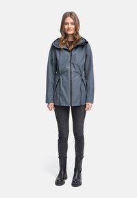 Joven con cabello ondulado, vestida con chaqueta impermeable azul con capucha, camisa negra y jeans gris oscuro, posando frente a un fondo liso.