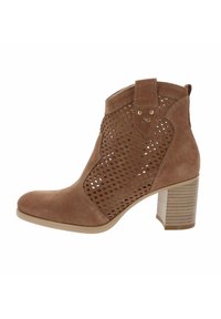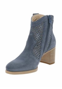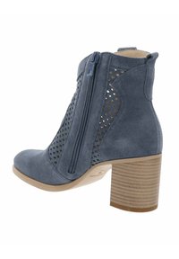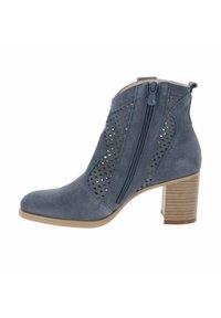 Botín de ante azul con paneles laterales perforados, cierre de cremallera y tacón bloque apilado, mostrado de lado.