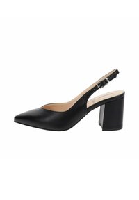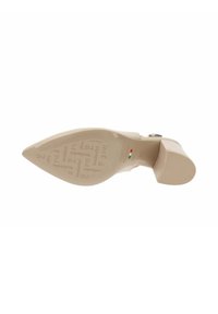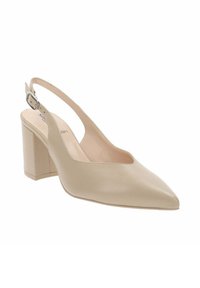 Zapato de salón beige de cuero con tira trasera, punta puntiaguda y tacón ancho, equipado con una correa ajustable con hebilla.