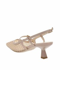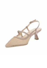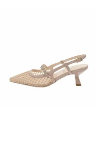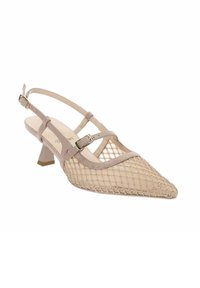 Zapato beige de tacón kitten con puntera puntiaguda, tiras traseras y malla superpuesta, con doble correa ajustable en el tobillo con hebillas doradas.